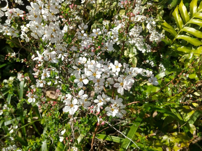 一般的なユキヤナギは蕾も白ですが、冒険の森では蕾がピンク色になる品種のユキヤナギが開花中です。