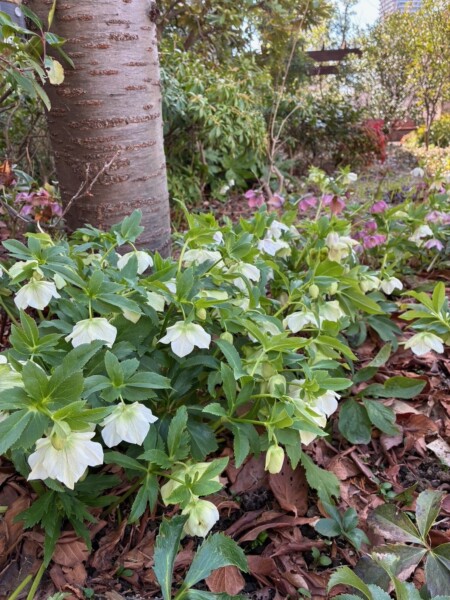 そして、ハーブガーデンではもうひとつ、真っ白な花(クリスマスローズ)が見頃を迎えています。